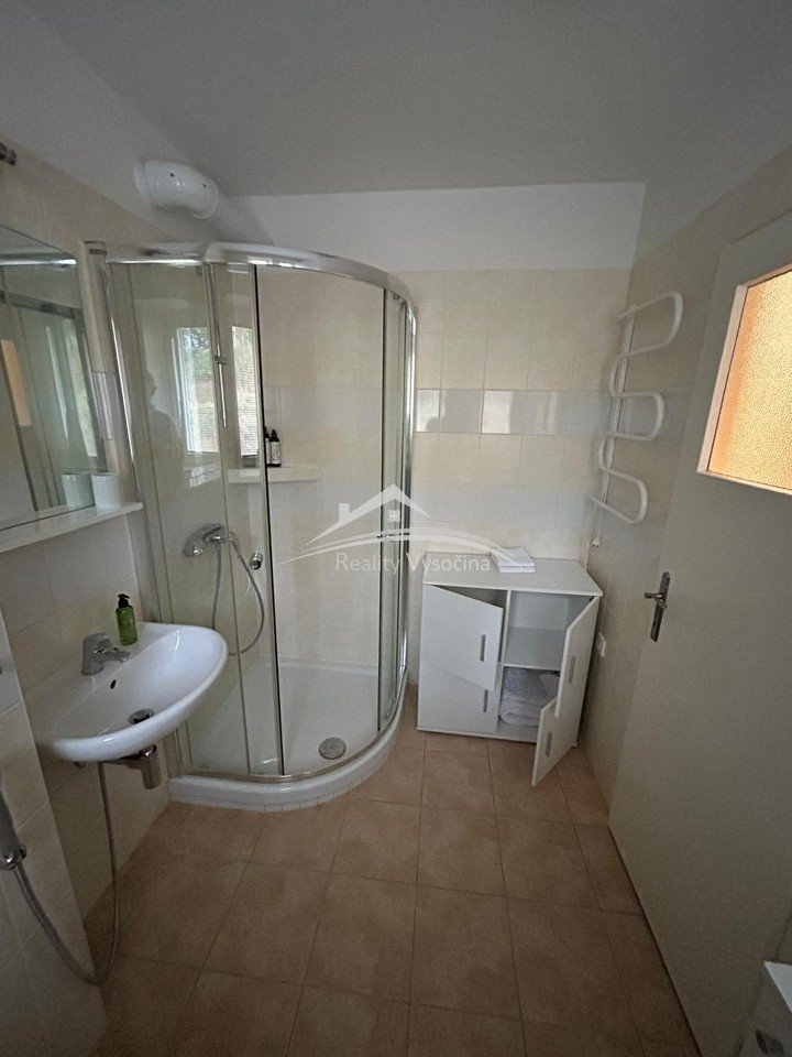 Dispozice zahrnuje zděné jádro s koupelnou vybavenou sprchovým koutem a splachovacím WC, komoru a sklepní kóji. Kuchyň je osazena zánovní linkou s vestavěnými spotřebiči – elektrickým sporákem, horkovzdušnou troubou a digestoří, dále je k dispozici pračka a lednice s mrazákem.